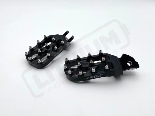 Our E-Moto Elite Foot Pegs are specifically designed to fit the lightweight E-Moto bikes. Forged from 7075T6 aluminum and CNC machined, these foot pegs offer immense strength. They include stainless teeth, with optional titanium teeth coming soon. The pegs use OEM springs and pivot pins. The platform is a massive 3 5/8" long x 2 3/8" (89 x 58mm), providing ample support and stability. The pegs are 1/4" back from the OEM location. Available in eight anodized colors.